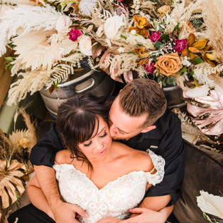 Vow renewals are a great way for vendors to showcase the newest trends, colours, ideas and skills they can offer while gifting the experience with a real couples (vs models). This couple had us in stitches the whole day while truly enjoying their love for each other! We got to showcase your tapped truck while vendors came together from all over Red Deer area and Edmonton to make this day happen and brought their A game to this industrial Venue just outside Sylvan Lake. The large arrangement of florals is really what made this shoot stand out, showcasing the muted colour trend of 2020 with touches of gold, dried pieces and tropical influences. If florals is on the top of your priority list for your big day we say GO FOR IT!